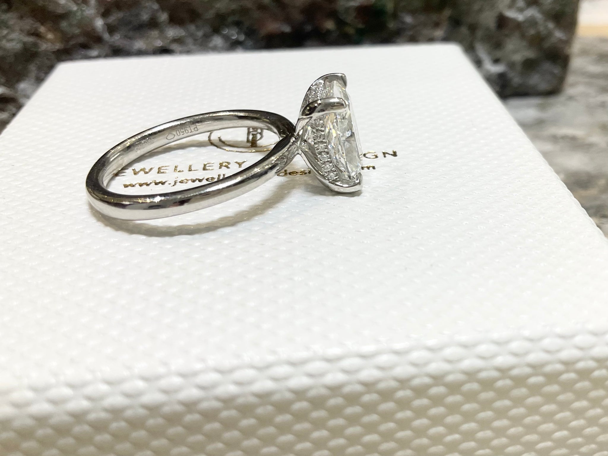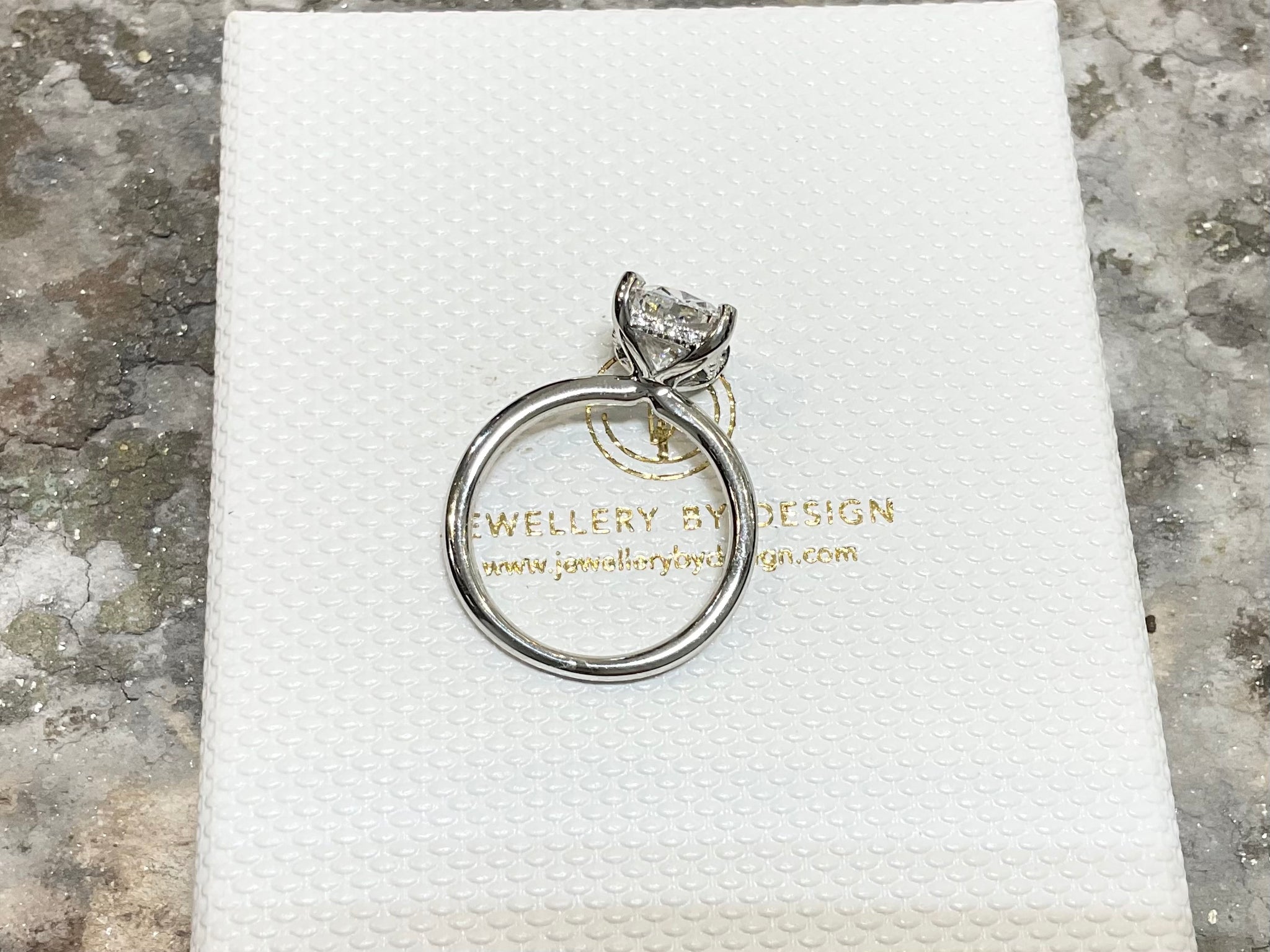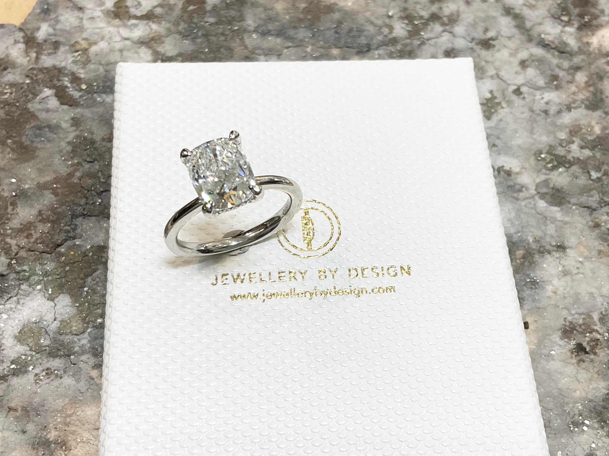 The centrepiece is a 2.79ct cushion cut lab-grown diamond, graded E colour and VS1 clarity, and accompanied by an IGI certificate confirming its exceptional quality. The diamond is elegantly held in a four-claw setting, allowing light to dance across each facet for maximum brilliance.