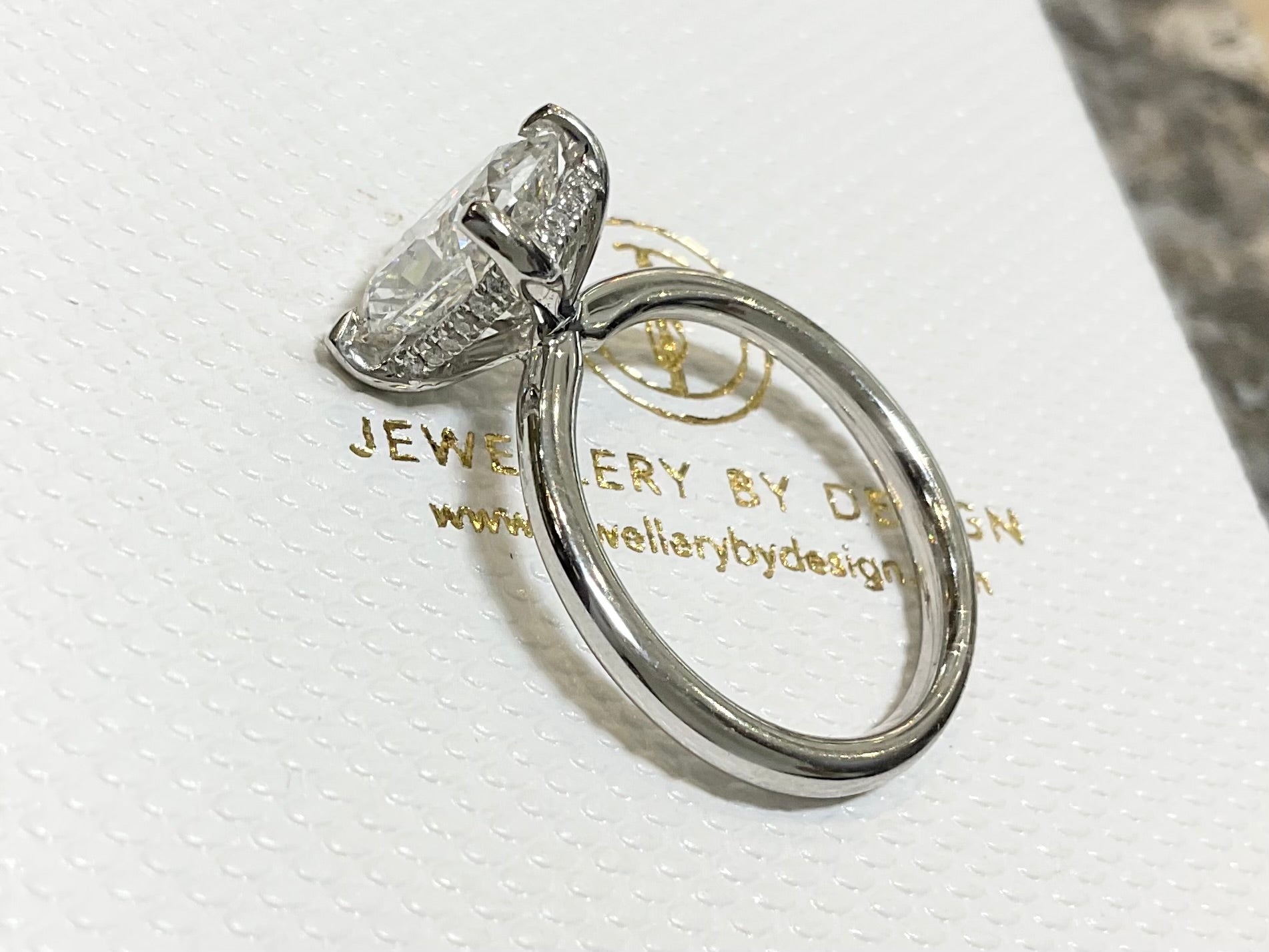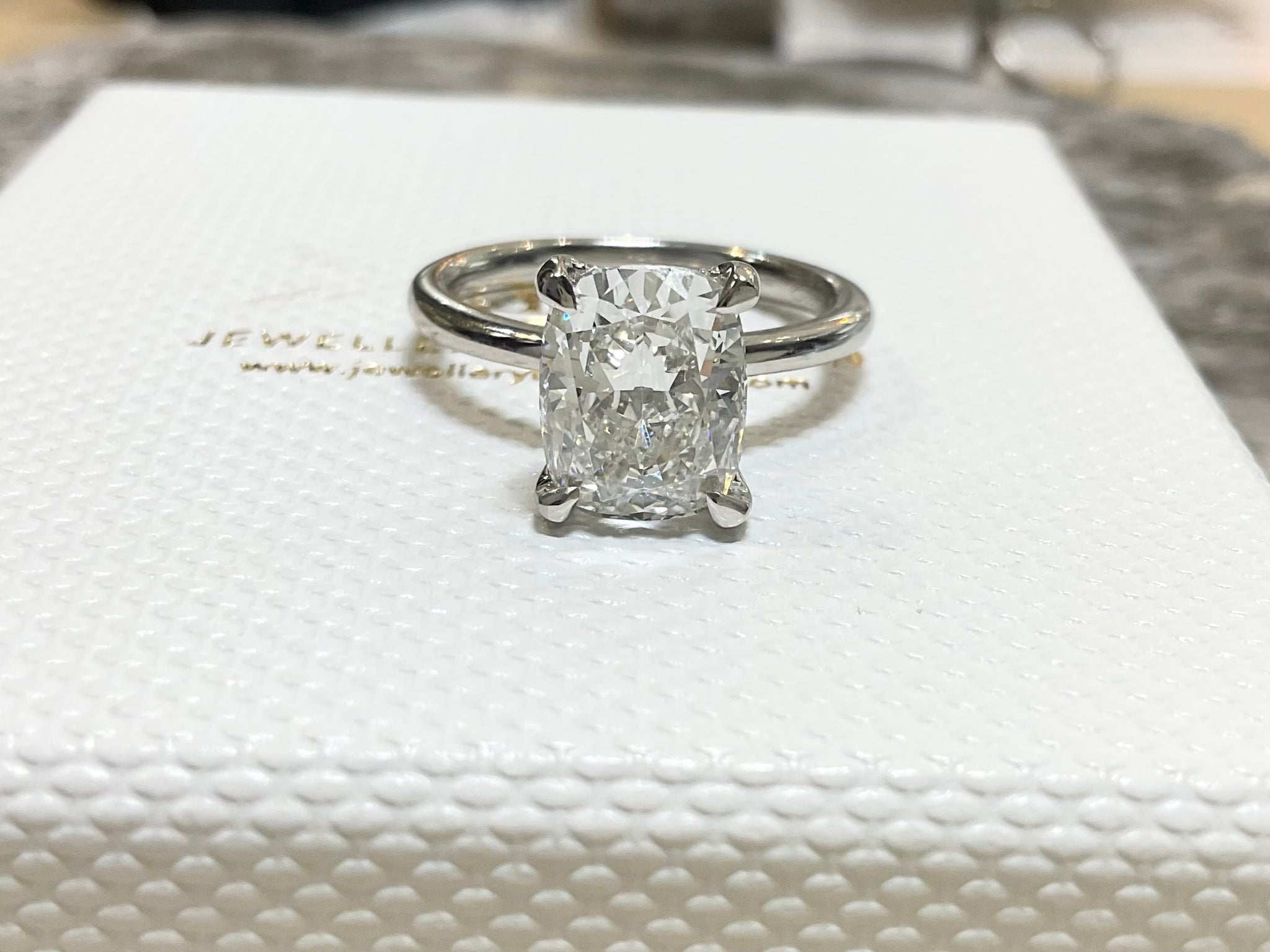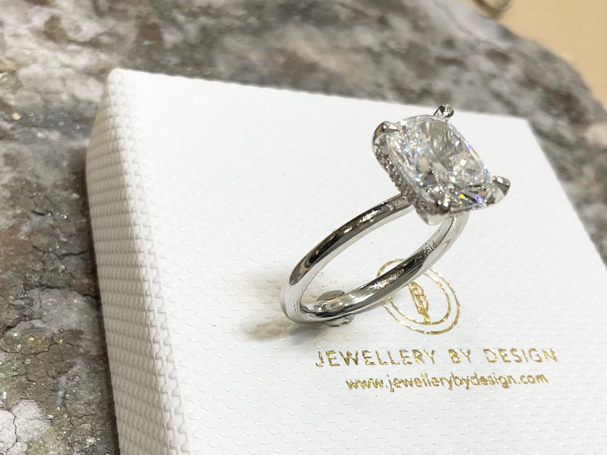 A stunning balance of timeless sophistication and modern craftsmanship, this platinum cushion cut lab-grown diamond ring is designed to captivate from every angle.