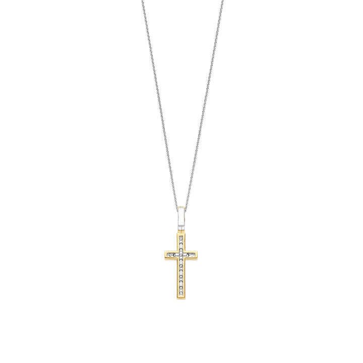 Celebrate enduring beauty with this TI SENTO gold-plated silver Cross Pendant 6857ZY. This pendant is crafted from 925 sterling silver and finished with radiant yellow gold plating. Its cross silhouette is pavé-set with brilliant cubic zirconia, shimmering with quiet strength and clarity. The contrast between warm gold and luminous stones brings timeless symbolism into refined balance. Nickel-free and hypoallergenic, it offers both sentiment and lasting comfort. The pendant comes with a dainty silver chain necklace.